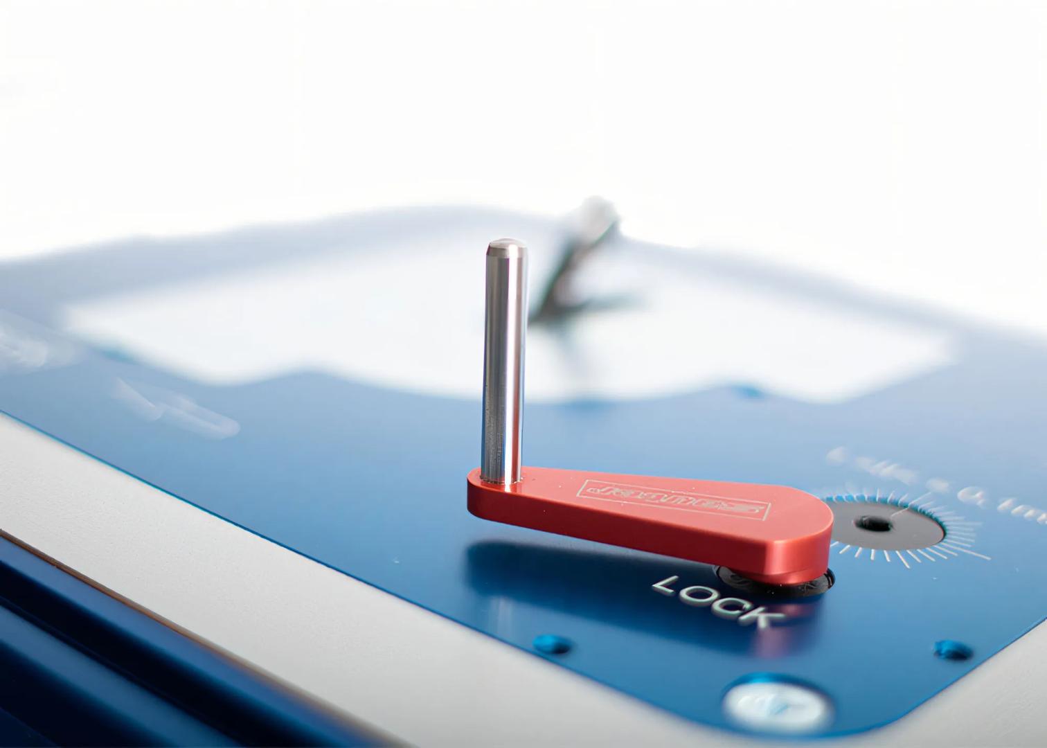 Réglage simple et précis de la profondeur de fraisage à 1/10 mm près. Plaque de base rigide grâce aux vis de guidage serrées des deux côtés. Changement de fraise facile avec levier et système à cliquet. Changement de bague de copiage sans outil.